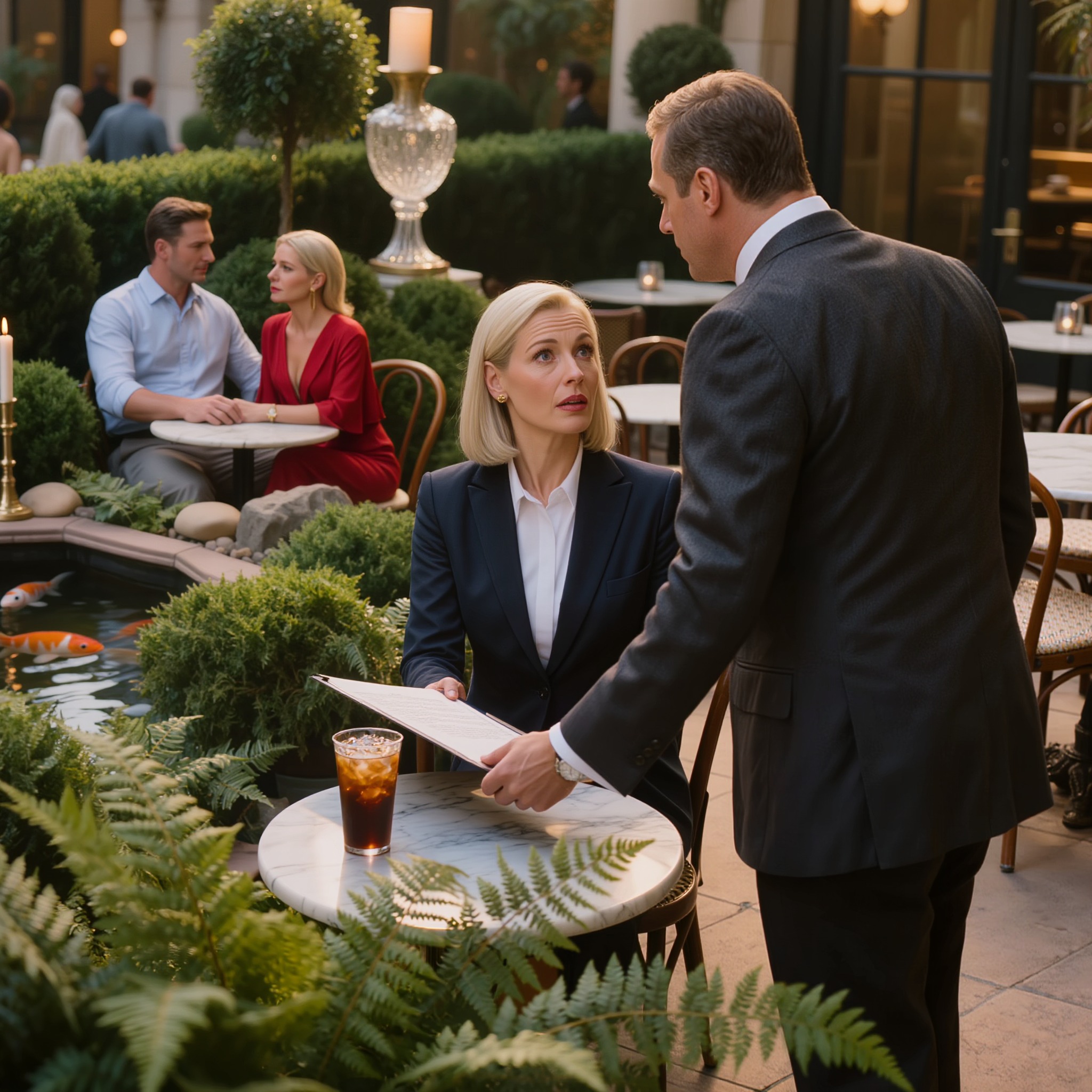 À une dizaine de mètres de là, à la table numéro six près du bassin à carpes koï, était assis mon mari, Kevin. Il n'était pas seul.